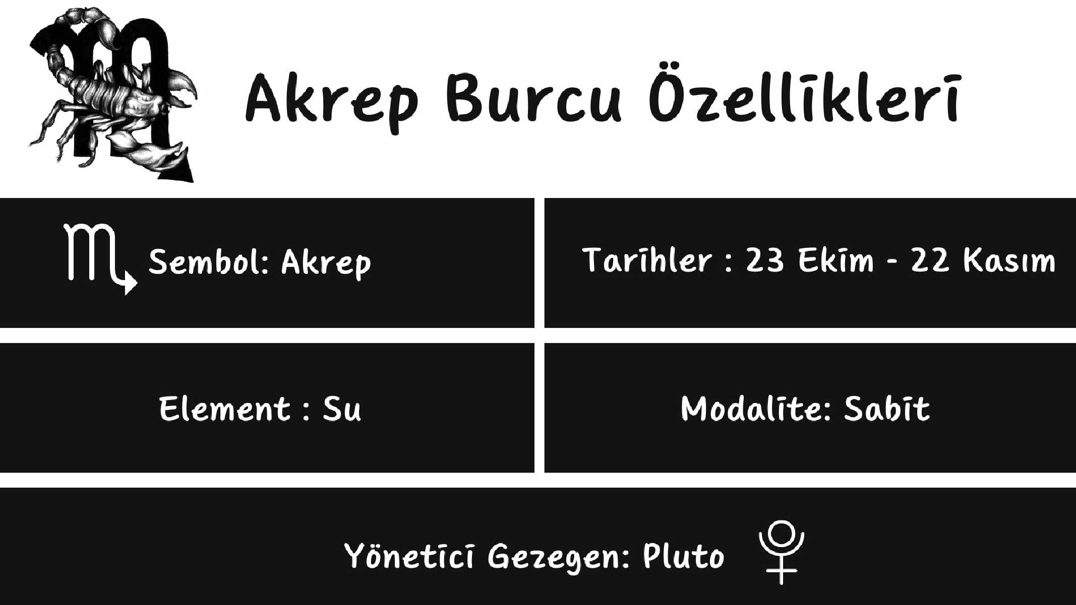 | Akrep ♏ | 23 Eki – 21 Kas | Su | Sabit | Plüton |