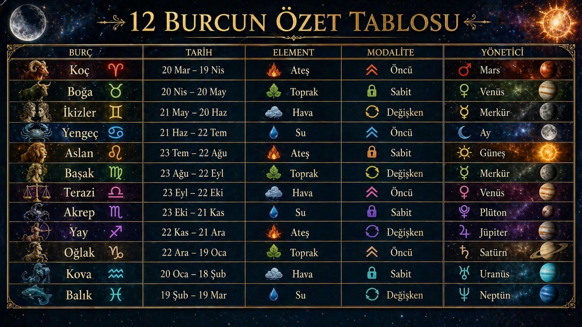 12 Burç Özellikleri: Tarihler, Özellikler, Elementler ve Yönetici Gezegenler Özet Tablosu