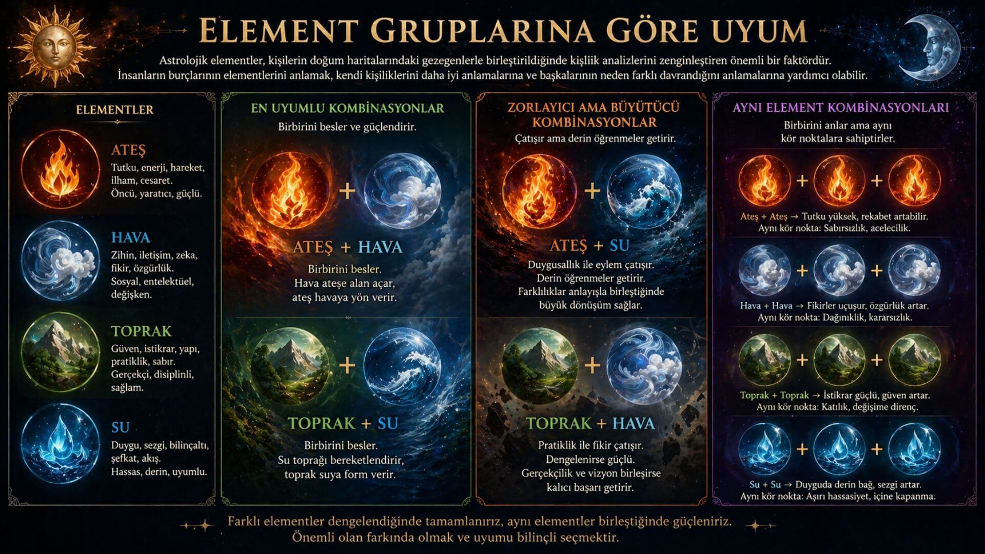 Genel kural olarak aynı element grubundaki burçlar uyumludur. Ateş + Hava ve Toprak + Su kombinasyonları da güçlüdür. Ama uyum yalnızca güneş burcuna bakılarak değil, doğum haritasının tamamına bakılarak değerlendirilmelidir.