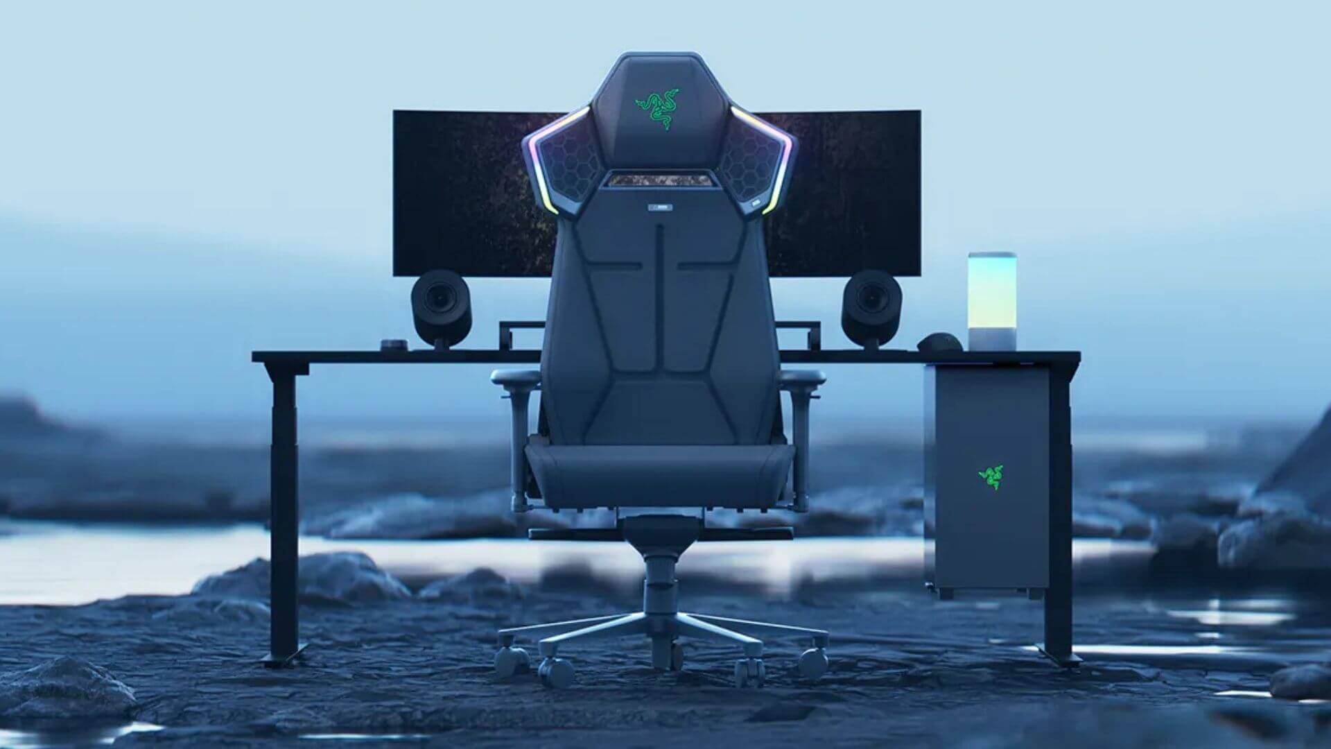 Baş dayanakları boyunca ışık şeritleri bulunan Razer’ın konsept sürükleyici oyun koltuğu, kayalık bir dış ortamda, su birikintileri arasındaki bir masanın önünde sergilendi.