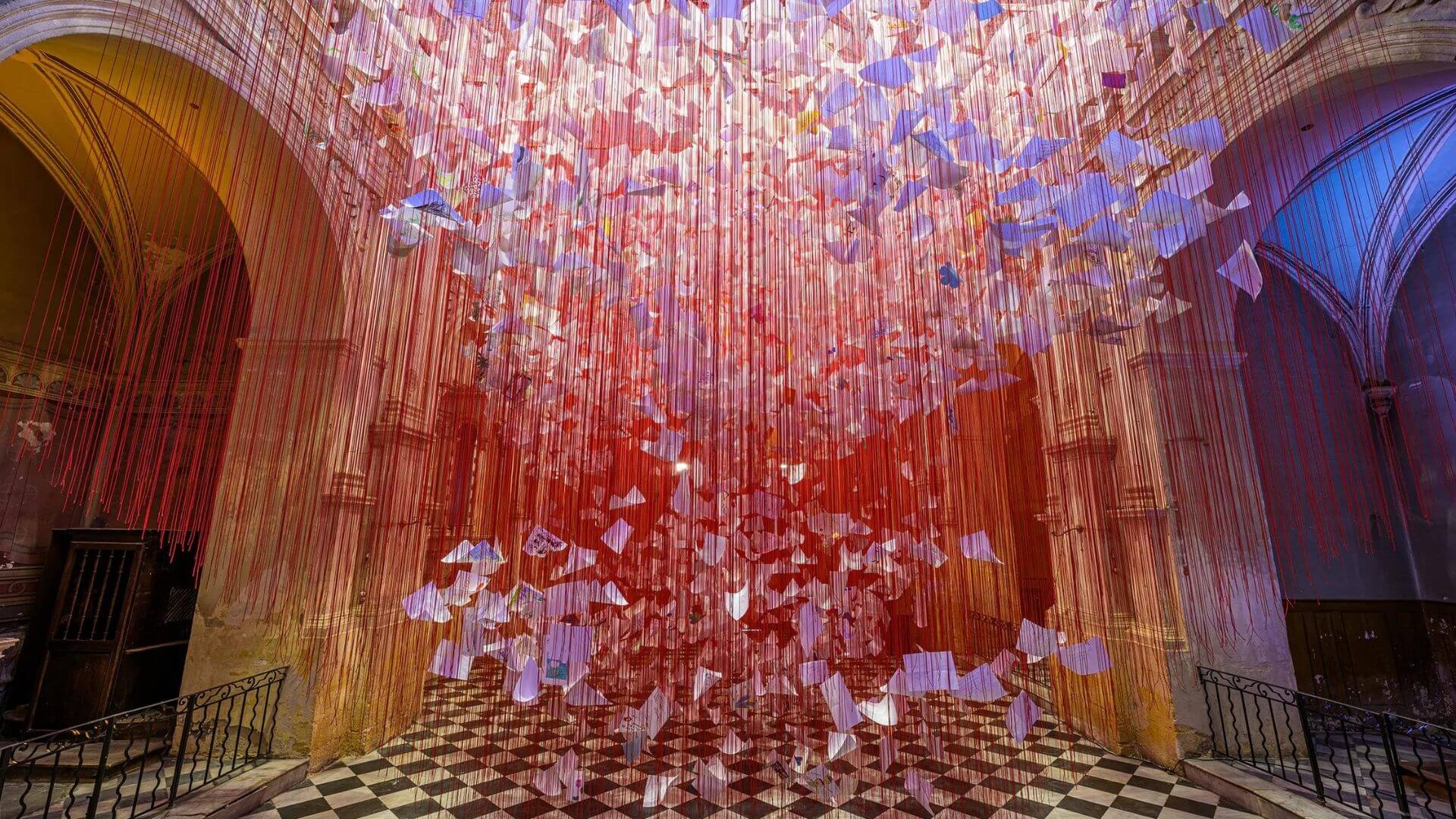 Sergideki kırmızı ipliklerden oluşan ağ yapısı, izleyiciyi çevreleyerek onları bu ağın içine çekiyor