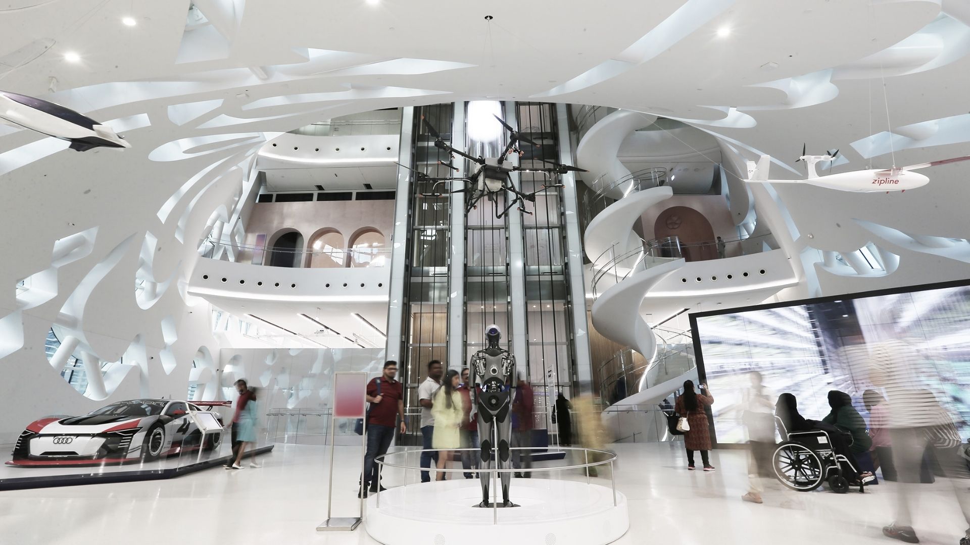 İçeride, artırılmış gerçeklik ve yapay zeka gibi ileri teknoloji sergileriyle ziyaretçiler, geleceğin dünyasına adım atıyorlar.