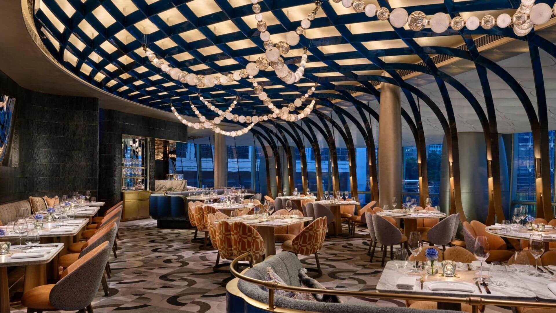 Girdap şeklindeki su enstalasyonu ve el işçiliği metal duvarlarla karşılanan konuklar, el boyaması tavanın serin mermer zeminler üzerinde süzüldüğü görkemli yemek salonuna adım atar. Pelüş kadife sıcaklık katarken, altın varakla kaplı heykelsi tavan bölmeleri The Henderson’ın kıvrımlı cephesini çağrıştırır. Mavi kaşık oyma ahşap duvarlar, Japon zanaatkarlığına gönderme yapar.