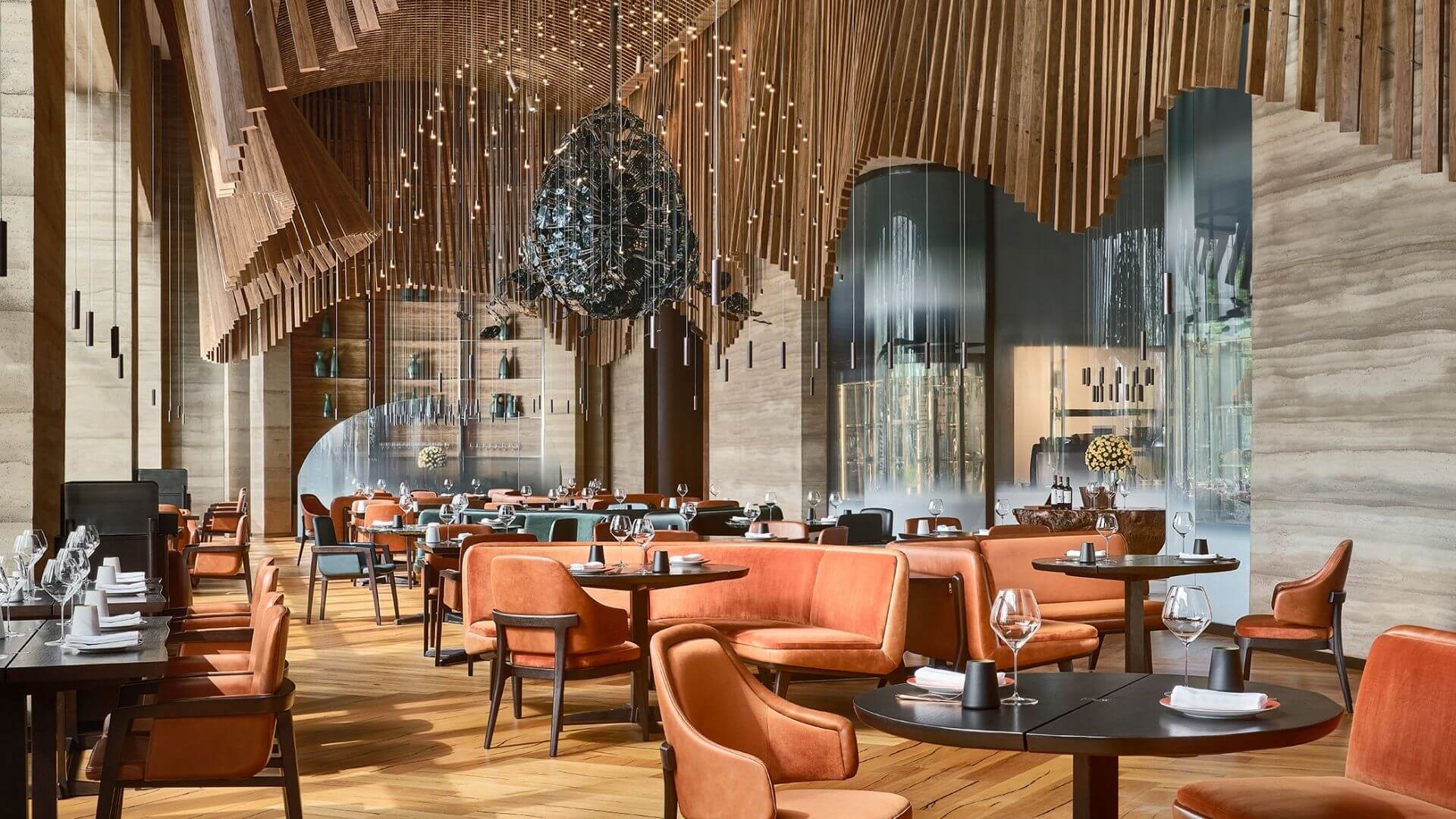 Fiamma’nın en çarpıcı özelliği, Qingdao’nun kutsal sedir ağaçlarından ilham alan el üfleme cam yerleştirmedir: dalgalanan ahşap bir mobilin dramatik tavan kompozisyonu içinde kristalimsi bir rüya gibi süzülen bu enstalasyon, mekan boyunca donmuş bir dalga gibi kıvrılarak ilerler. Sıkıştırılmış toprak duvarlar ve füme meşe, burgundy-avcı yeşili deri oturma düzeniyle buluşarak dokunsal bir sıcaklık yaratır.
