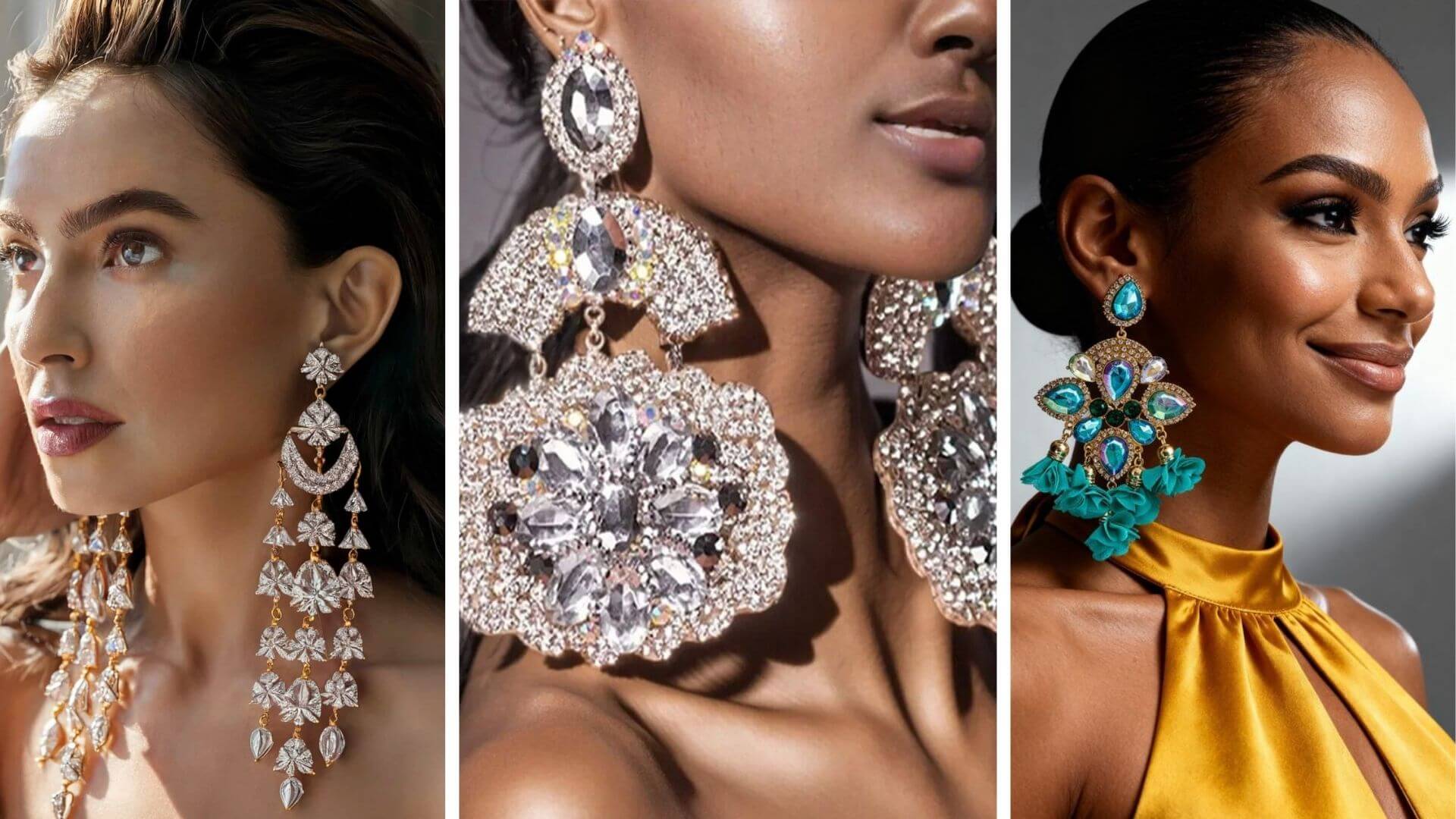 Taşlı statement küpe 2026 — siyah minimal elbise üzerinde büyük kristal küpe gece kombini