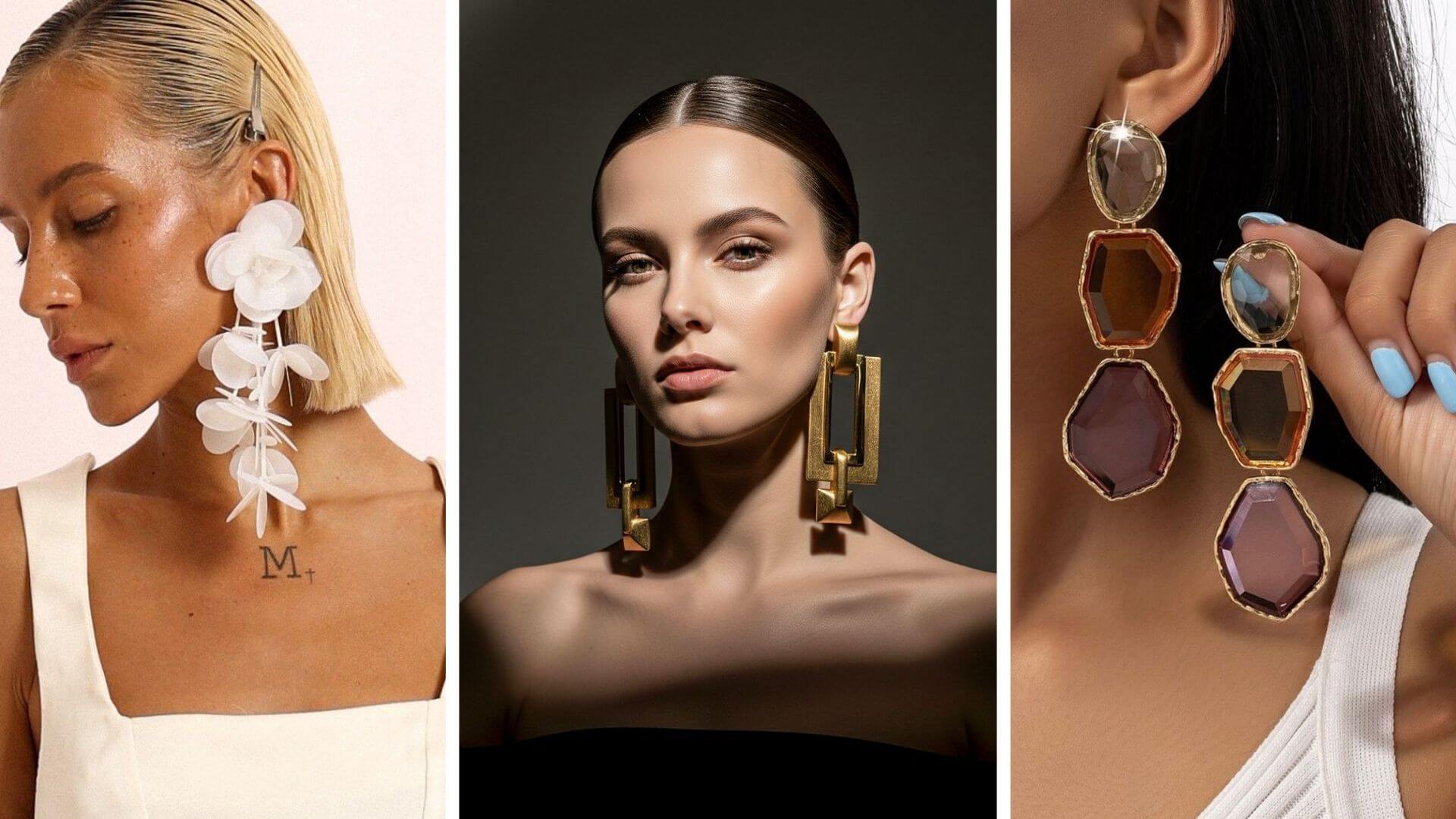 Asimetrik büyük küpe trendi 2026 — tek renk kombin üzerinde farklı boy ve formda iki küpe stil önerisi