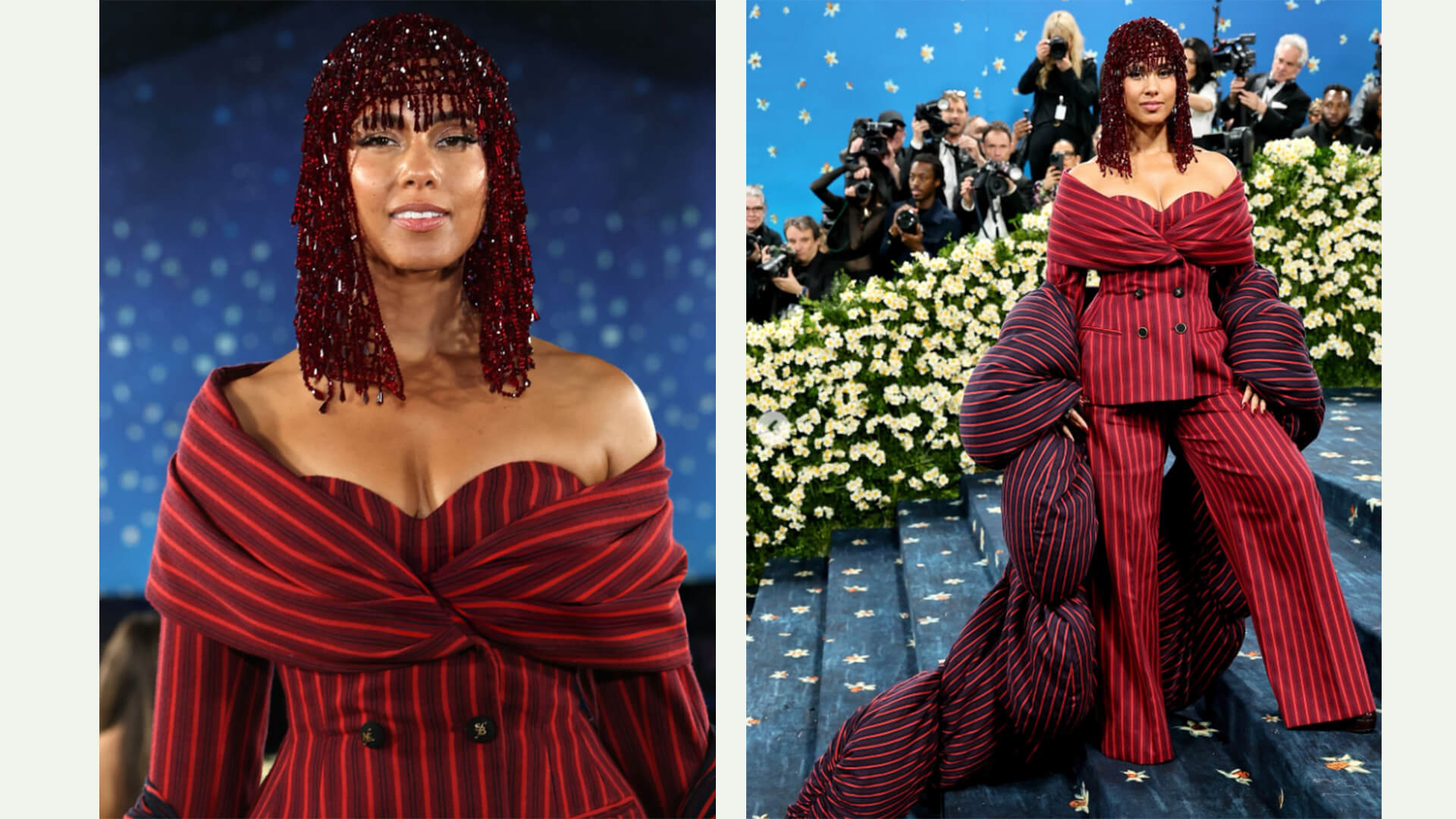 Hip-hop ve R&B’nin güçlü çifti Alicia Keys ve Swizz Beatz çizgili kıyafetlerle ikiz tarzındaydı. Keys, Edward Enninful’un tasarladığı Moncler x EE72 markasını giydi.