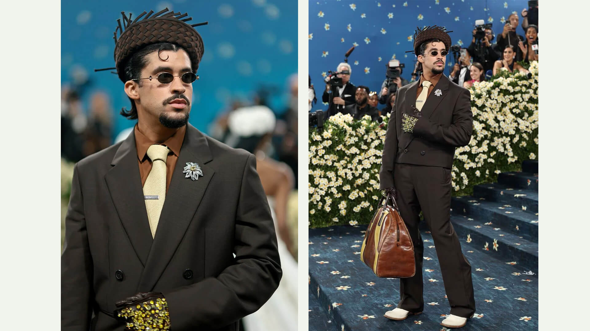 Bad Bunny, taşlı eldivenler ve 2000’ler tarzı bir bowling çantasıyla stilize edilmiş, keskin çizgilere sahip kahverengi bir Prada takım elbiseyle etkinliğe katıldı. Görünümünü, Porto Riko’ya bir saygı duruşu olarak bir pava şapkayla tamamladı.