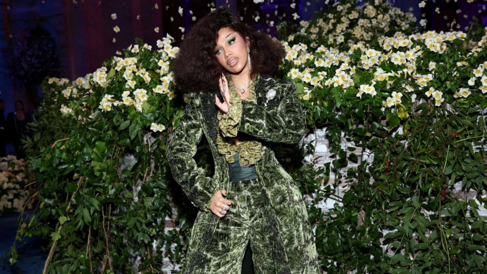 Cardi B, zengin orman yeşili tonlarında kadife, özel dikim bir Burberry takımı tercih etti.