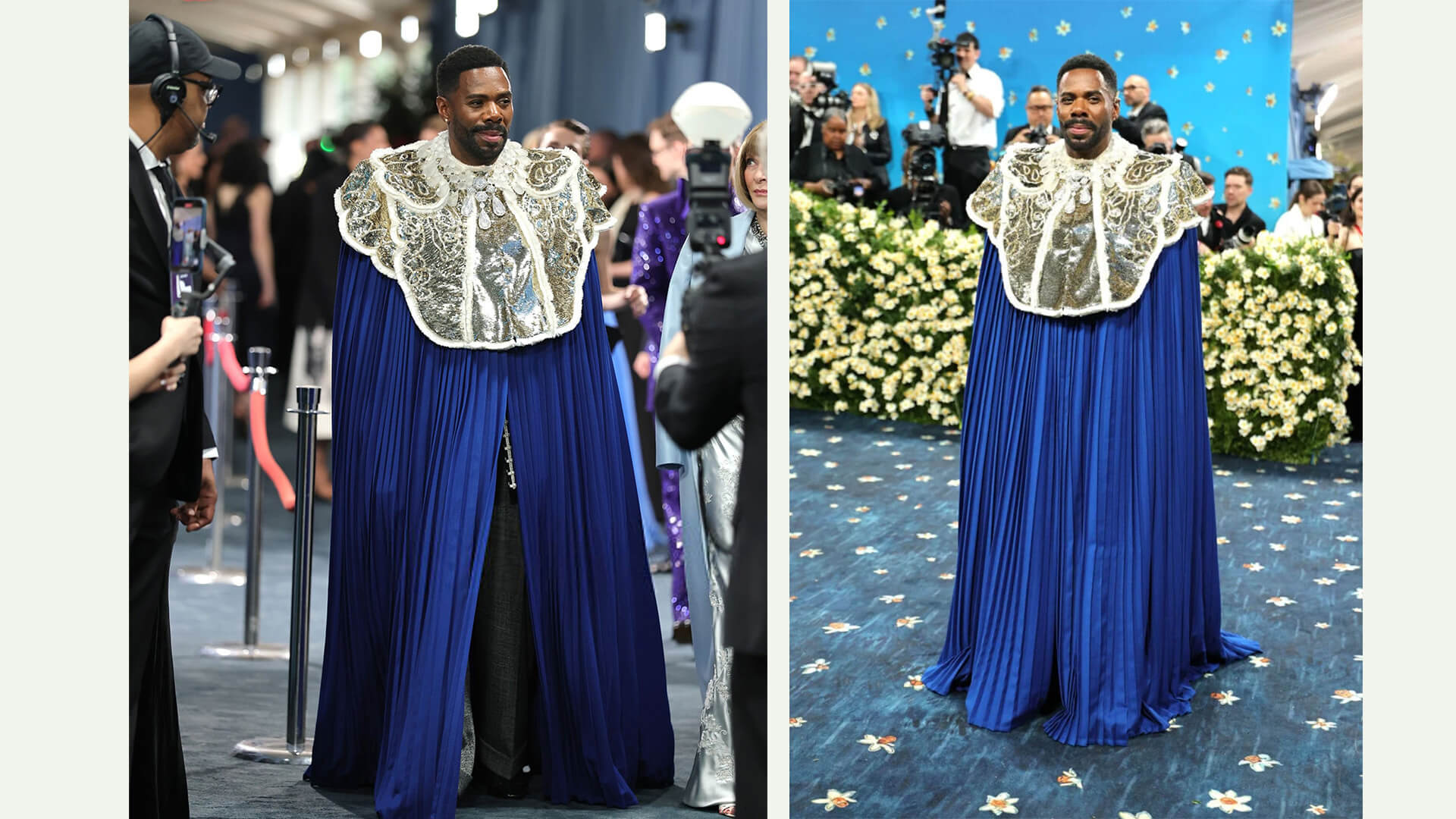 Met Gala eş başkanı Colman Domingo, geceye erken giriş yaptı ve özel dikim mavi Valentino peleriniyle gecenin tonunu belirledi.