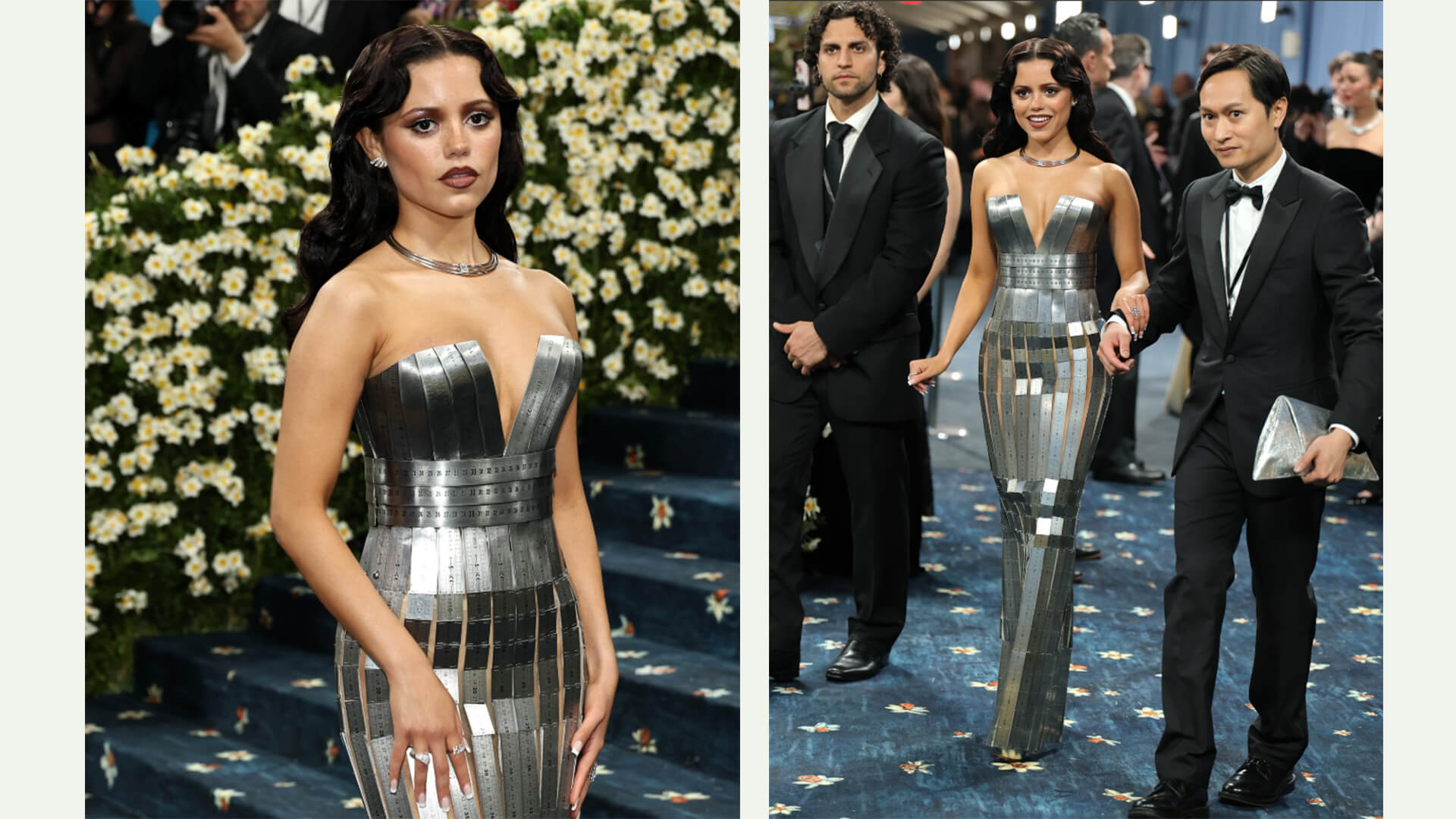 Jenna Ortega, Olivier Rousteing’in Balmain için tasarladığı panelli metalik bir elbise giydi.