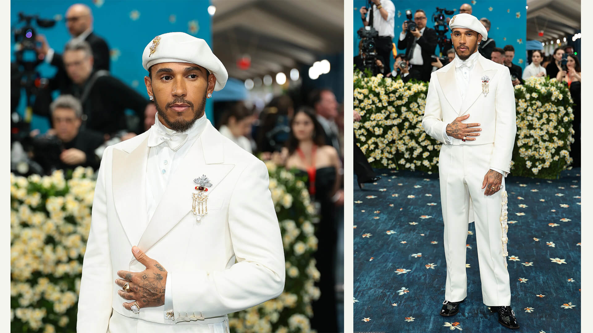 Lewis Hamilton, bu yılki Met Gala’nın eş başkanlarından biri. Etkinliğe Wales Bonner imzalı fildişi tonlarında bir takım elbiseyle katıldı.
