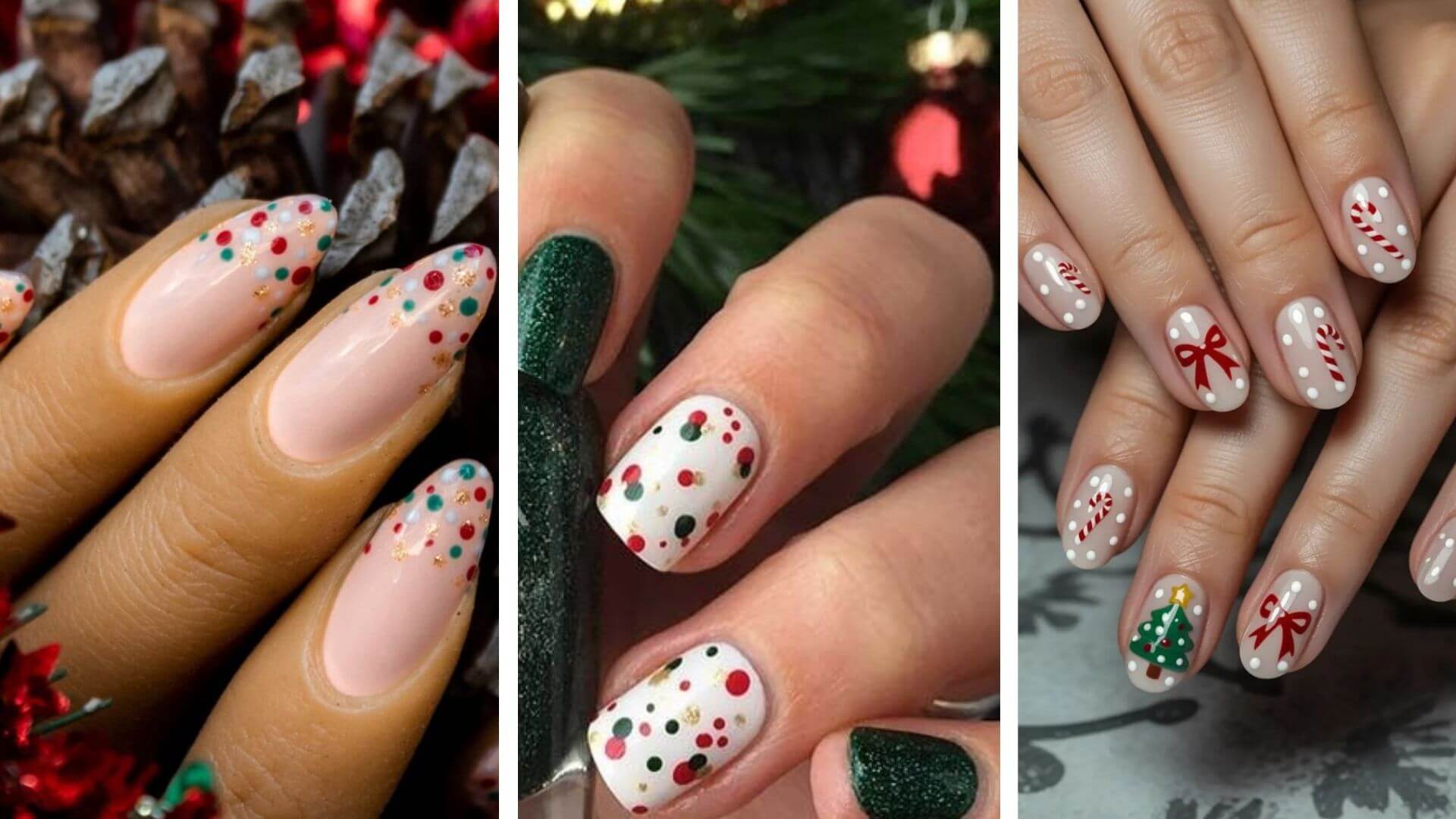Küçük noktalarla üçgen şeklinde oluşturulmuş minimalist Noel ağaçlarıyla eğlenceli bir görünüm elde edin. Ağaçlar için yeşil oje kullanın ve tepesine küçük bir altın veya gümüş yıldız ekleyin. Bu tasarım hızlı yapılabilir. Ve yeni başlayanlar için idealdir.