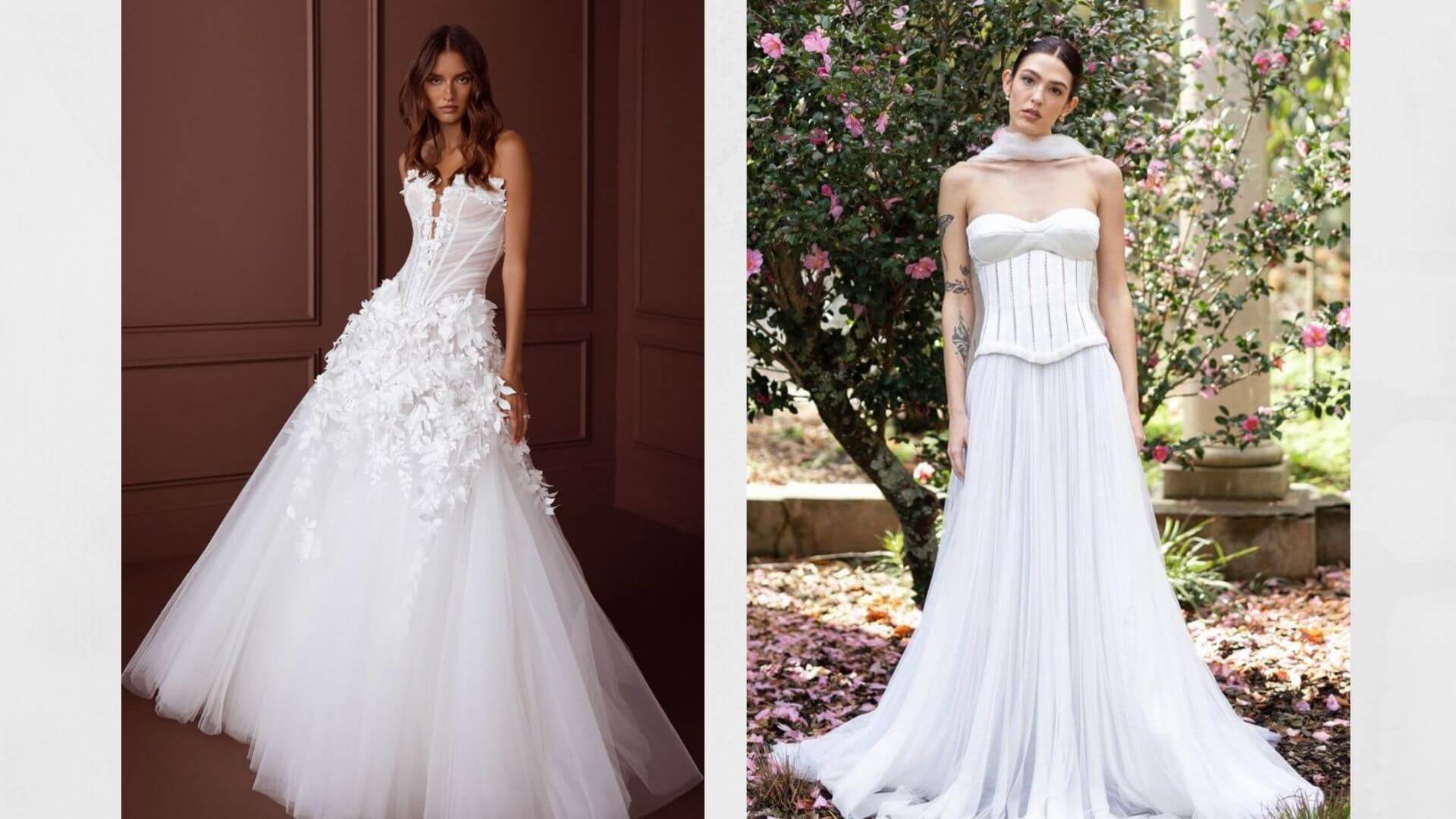 Tül etekler ve basque (V şeklinde) bel detayları, bu yılın gelinlik tasarımlarında önemli bir yer tutuyor. Bu detaylar, dramatik bir siluet oluşturarak gelinliğin dikkat çekici olmasını sağlıyor.