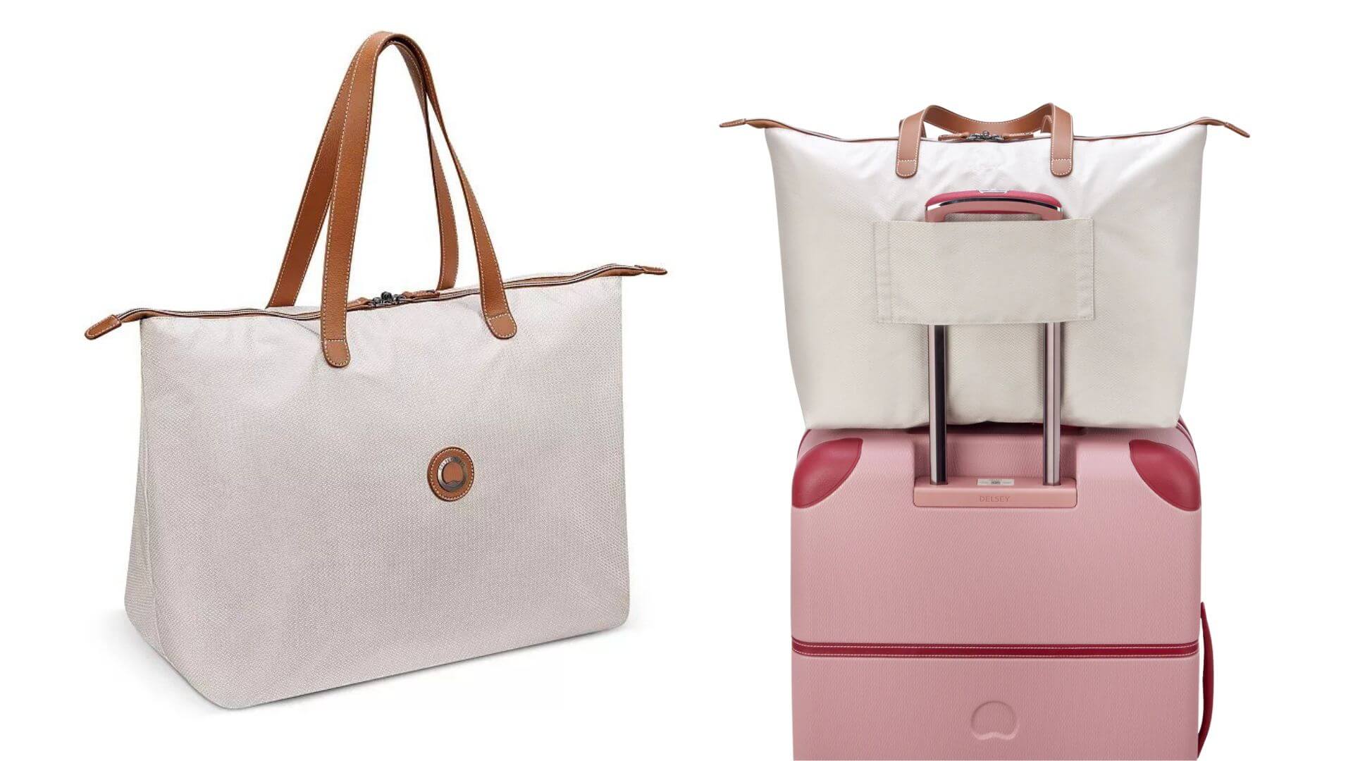 Fransız marka Delsey’nin katlanabilir tote çantası; katlanınca kompakt, açınca ek bagaj güvencesi. Fermuarlı cep, valiz sapı ve rahat taşıma kapağı sunar. İç astar geri dönüştürülmüş pet şişeden ve vegan deriden.
