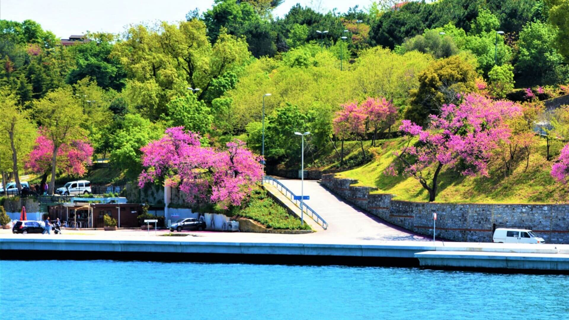 Boğaz kıyıları, erguvanın en teatral sahnesi. Morun ince tonları suyun serin mavisiyle karşılaştığında, ortaya yalnızca bir manzara değil, neredeyse hissedilen bir atmosfer çıkar.