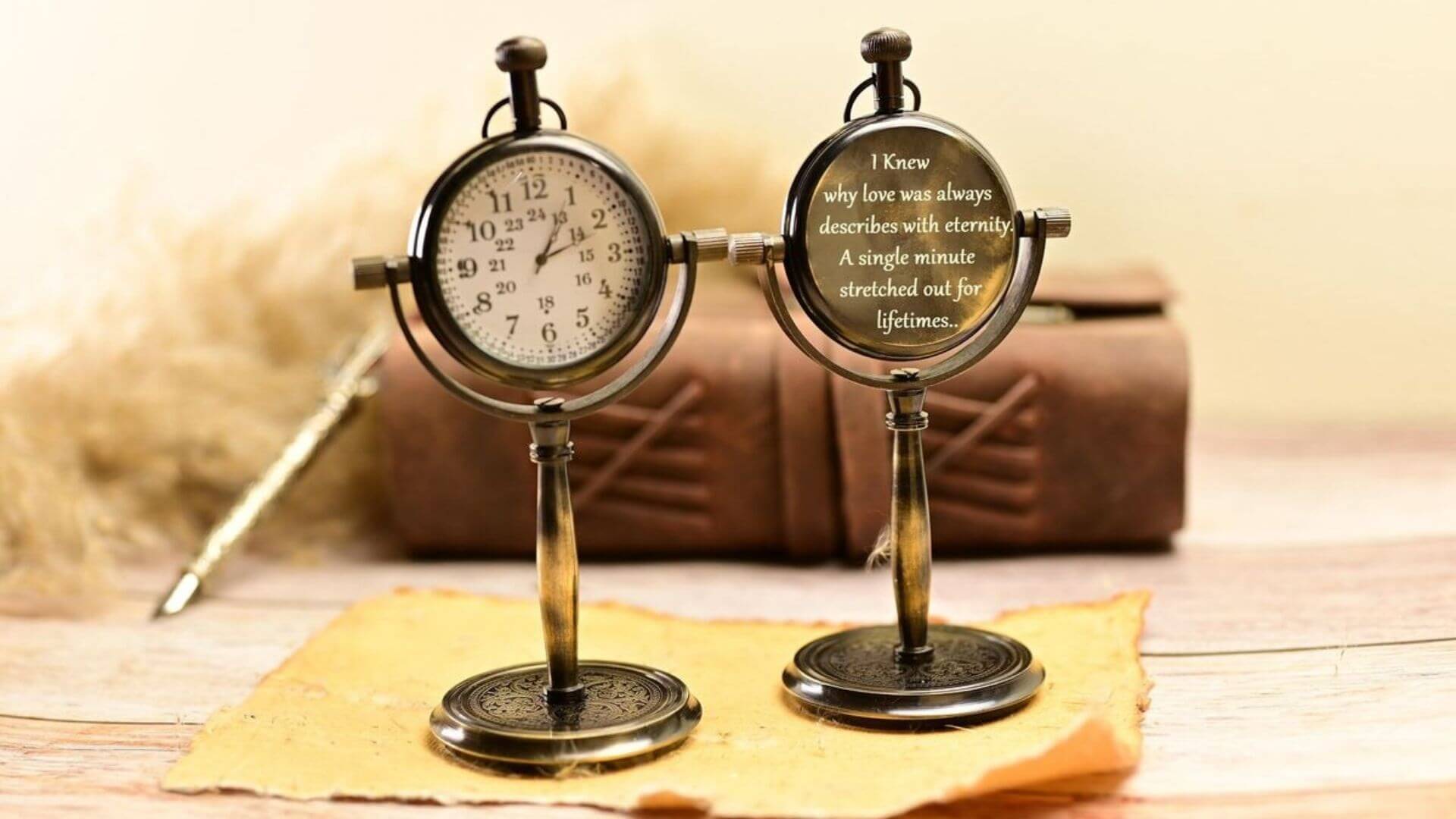 Gravürlü saat. Özel anları simgeleyen anlamlı bir hediye. Zamanın değerli olduğunu ve yeni başlangıçların beklediğini hatırlatır.