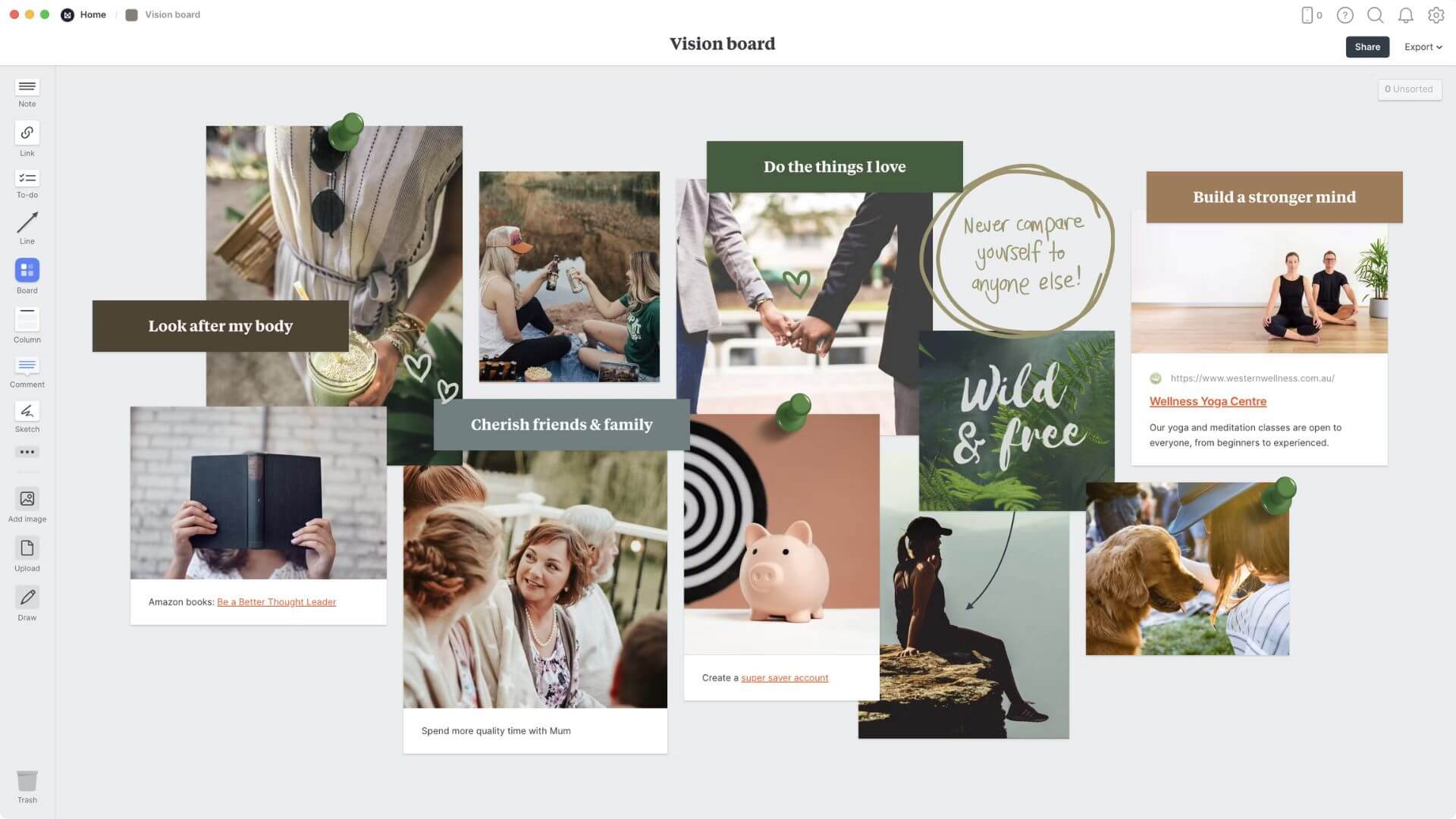 En etkili hayal panoları, seni heyecanlandıran ve gözlerinin motive edici tüm görsel ve kelimeler üzerinde dolaşmasını sağlayan panolardır. Bu adımdan keyif al. Hareketin getirdiği ilhamla oyna ve içgüdüne uyana kadar farklı düzen seçeneklerini dene. Bu düzenleme süreci, gelecek için daha net ve ayrıntılı bir vizyon geliştirmenin bir parçasıdır.
